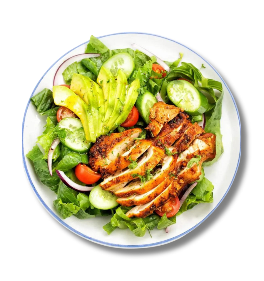 Indulge in our mouthwatering Grilled Chicken Salad, a delightful blend of tender grilled chicken strips atop a bed of crisp mixed greens, cherry tomatoes, cucumbers, and sliced avocado, all tossed in a zesty vinaigrette dressing.